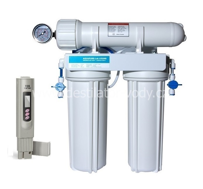 zařízení na výrobu laboratorní destilované/deionizované vody středního výkonu. Jde o filtrační průtokový systém s kontinuálním průtokem. Nejedná se o klasickou destilaci vody ohřevem a odpařováním. Destilátor vody PURE-Lab pracuje na fyzikálním principu čištění vody, bez využití elektrické energie. Celý proces výroby vody probíhá na základě tlaku vody v potrubí. Ideální pracovný tlak vody je 4-6 bar (max.).